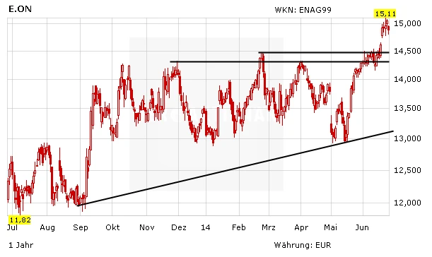 DER AKTIONÄR sieht durchaus Potenzial für beide Werte. Im Energiesektor dürfte sich nun die Bodenbildung abgeschlossen sein. Auf europäischer Ebene gelten die deutschen Versorger als aussichtsreiche Nachzügler. Allerdings ist E.on für die Energiewende besser positioniert. Das Kursziel lautet nach wie vor 17,00 Euro. Investierte Anleger sichern ihre Position mit einem Stopp bei 12,80 Euro ab. DER AKTIONÄR spekuliert im Real-Depot mit Hebel auf steigende Kurse bei dem DAX-Schwergewicht.