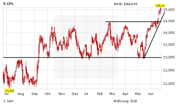 Auch E.on steht der positiven Kursentwicklung nicht hinterher. Mit dem Ausbruch über die 14,50 Euro ist der Sprung auf ein neues Jahreshoch gelungen. Damit hat der Wert seine Seitwärtsrange die seit Oktober 2013 läuft verlassen.