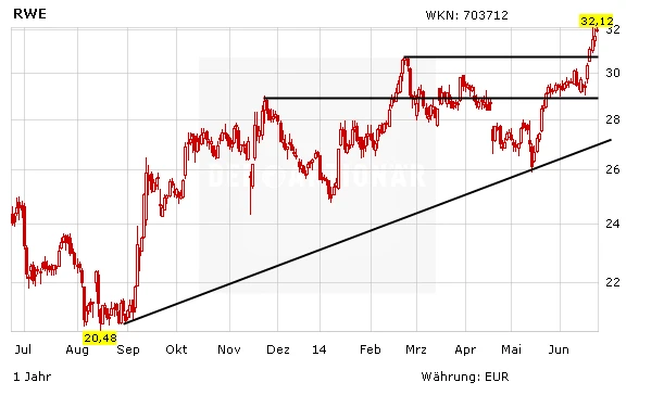 Charttechnisch betrachtet ist der RWE-Aktie mit dem Ausbruch über die 31-Euro-Marke ein wichtiger Schritt gelungen. Damit dürfte die Bodenbildung abgeschlossen sein und der Wert könnte nun wieder Fahrt aufnehmen. Luft hat die Aktie durchaus bis 34,50 Euro.