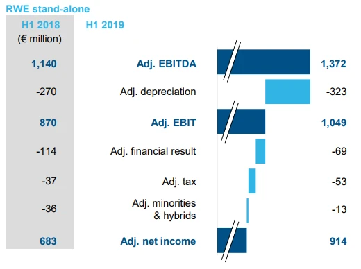 Dank eines starken Energiehandelsgeschäfts hat der DAX-Konzern RWE den Gewinn im ersten Halbjahr 2019 im Vergleich zum Vorjahreszeitraum klar gesteigert. Das bereinigte Nettoergebnis für RWE-Stand-Alone erreichte 914 Millionen Euro nach 683 Millionen Euro im ersten Halbjahr 2018. Das bereinigte Ergebnis vor Zinsen, Steuern und Abschreibungen (EBITDA) lag bei 1,37 Milliarden. In den ersten sechs Monaten des vergangenen Jahres waren es noch 1,14 Milliarden Euro.