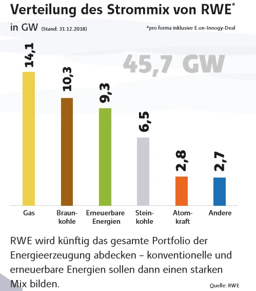 RWE wird dann die gesamte Palette der Energieerzeugung abdecken (siehe Grafik). Damit muss der Versorger keine Angst mehr vor Kohle- und Atomausstieg haben. Offen bleibt derweil, wie hoch mögliche Kompensationszahlungen für das Kohleaus ausfallen. CEO Rolf Martin Schmitz forderte Anfang des Jahres 1,2 bis 1,5 Milliarden Euro je Gigawatt. Das könnte etwas hoch gegriffen sein – rund die Hälfte gab es 2016 für die Braunkohle-Blöcke, die in Sicherheitsbereitschaft gingen.