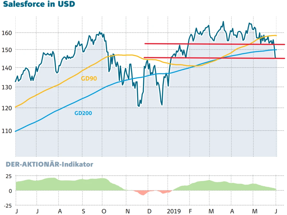 Auch Salesforce konnte sich der schlechten Gesamtlage am Markt nicht entziehen. An der Heimatbörse verlor die Aktie am vergangenen Handelstag mehr als vier Prozent und fiel damit unter die wichtige 200-Tage-Linie. Die nächste Unterstützungszone liegt nun bei 145 Dollar. Damit sieht die charttechnische Situation vor den Zahlen alles andere als gut aus.