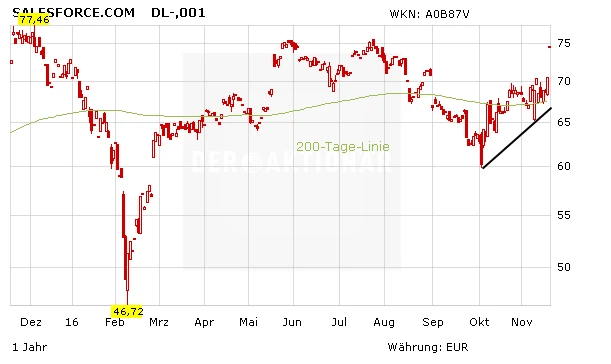 Der Gewinn pro Aktie stieg auf 0,24 Dollar je Aktie gegenüber den von Analysten erwarteten 0,21 Dollar. Die Umsätze wuchsen um 25 Prozent im Vorjahresvergleich auf 2,14 Milliarden Dollar. Mit diesen Zahlen sind die schwächelnden US-Verkäufe des letzten Quartals vergessen und es kann neuer Schwung aufgenommen werden. Der noch junge Aufwärtstrend kann hiervon ebenfalls profitieren. Das Allzeithoch von 84,47 Dollar scheint nur noch einen Katzensprung (6 Prozent) entfernt.