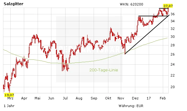 Der Protektionismus in den USA, Strafzölle in Europa und die Hoffnung auf eine Konsolidierung in der Branche dürften die Stahlpreise steigen lassen. Der Preisanstieg bei Rohstoffen wie Kokskohle erleichtert es den Stahlkonzernen zudem, höhere Preise gegenüber den Kunden zu rechtfertigen. Von dieser Fantasie profitiert auch Salzgitter. Anleger lassen die Gewinne laufen und ziehen den Stoppkurs auf 29 Euro nach.