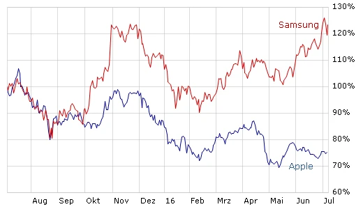 Während Samsungs Aktie durch die Zahlen einen erneuten Auftrieb bekommen hat, heißt es für Apple vorerst abwarten. Seit Jahresbeginn verzeichnet sie einen Verlust von knapp neun Prozent. Am 26. Juli wird Apple mit den Q2-Zahlen dann die endgültige Grundlage für den Vergleich mit Samsung liefern.