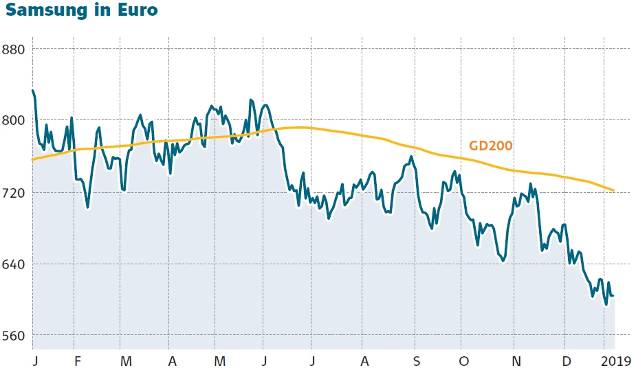 Deutlich schwerwiegender als der Rückgang im Smartphonegeschäft wiegt die Entwicklung im Verkauf von Speicherbausteinen. Denn dieser trägt den größten Teil zum Umsatz von Samsung bei. Den Gewinn belasteten im vergangenen Quartal deutlich sinkende Erlöse für Flash-Speicher. Allein seit Anfang Oktober ging der Preis um über fünf Prozent zurück. Das japanische Analysehaus Nomura erwartet für 2019 einen weiteren Preisverfall von bis zu 44 Prozent.