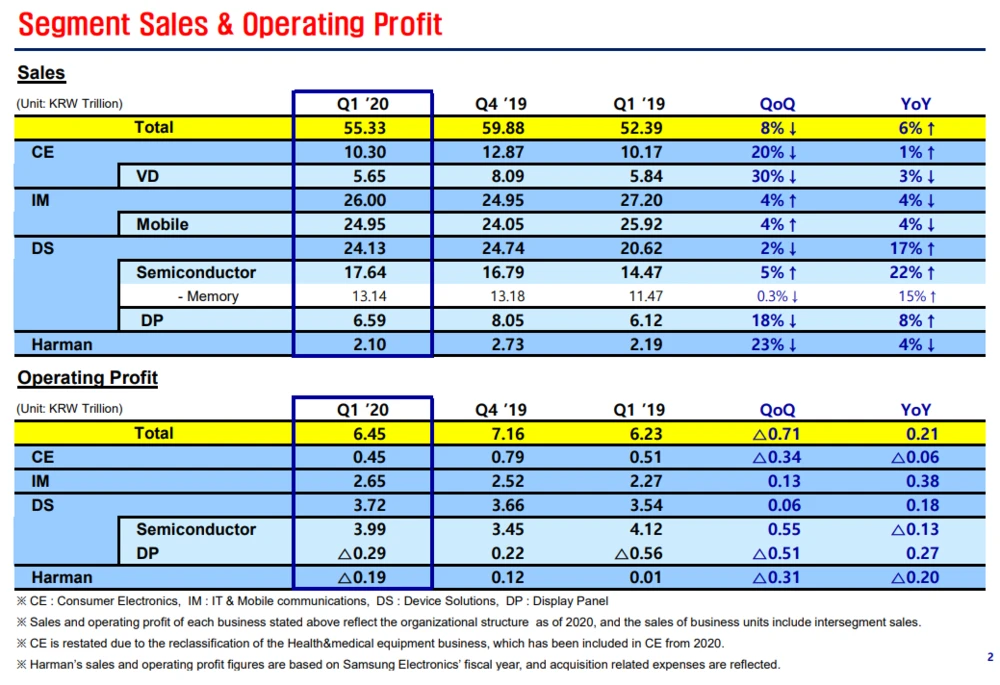 „Ein schrumpfender Markt und Ladenschließungen lassen Gewinnrückgänge unvermeidlich erscheinen“, heißt es lakonisch im neusten Geschäftsbericht von Samsung. Zwar legte der Gewinn bei den Handys im ersten Quartal noch um 17 Prozent auf 2,65 Billionen Won (zwei Milliarden Euro) zu. Der Umsatz mit Smartphones sank im selben Zeitraum aber von 25,92 Billionen Won (19,57 Milliarden Euro) auf 24,95 Billionen Won (18,84 Milliarden Euro).