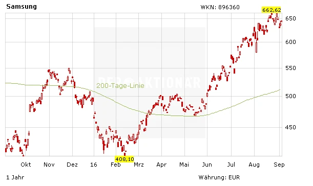 Den Rückruf des neuen Galaxy-Flaggschiffs nehmen die Samsung Aktionäre gelassen hin. Kein Wunder: Die Kosten der Umtauschaktion betragen nur fünf Prozent des erwarteten Nettogewinns von 18,5 Milliarden Euro. Hinzu kommen Umsatzerwartungen von plus drei Prozent und eine Nettogewinnsteigerung um 23 Prozent für das Jahr 2016. Bei einem laufenden KGV von 11,5. Der durchschnittliche Zielkurs des Samsung Papiers liegt bei 745 Euro.