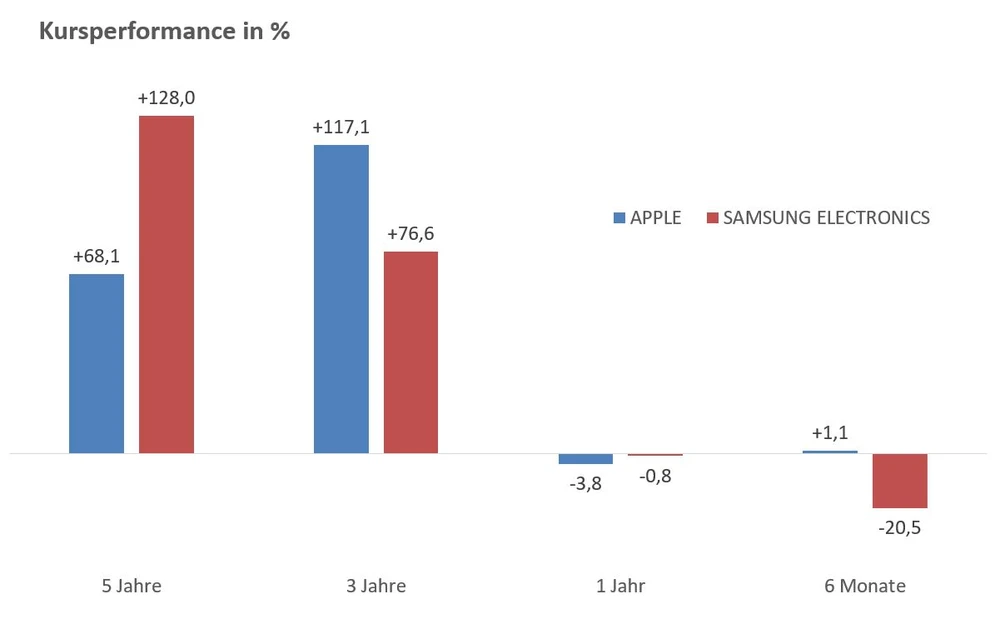 Mit Blick auf die Bewertung ist Samsung derzeit zwar günstiger als Apple. Das war allerdings auch schon in der Vergangenheit der Fall. Je nach Betrachtungszeitraum haben sich die beiden Widersacher bei der Performance abgewechselt. Auf Sicht der letzten sechs Monate ist Samsung klarer Spitzenreiter. Dennoch favorisiert DER AKTIONÄR Apple vor den Koreanern, da Apple seine Umsatzbasis auf besser planbare Service- und Abo-Erlöse verbreitert.