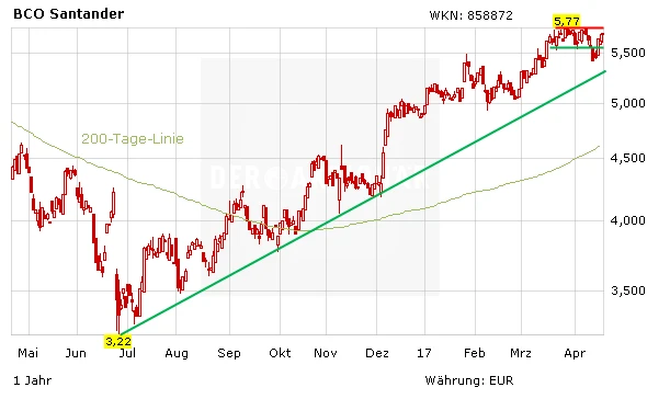Die Aktie der Banco Santander befindet sich auf dem Weg Richtung 6,00 Euro, einzig der Widerstand bei 5,80 Euro müsste noch überwunden werden. Der seit Juni 2016 bestehende Aufwärtstrend ist weiter gültig. Eine Unterstützung liegt im Bereich von 5,70 Euro. Ebenfalls positiv ist die steigende 200-Tage-Linie bei 4,62 Euro.
