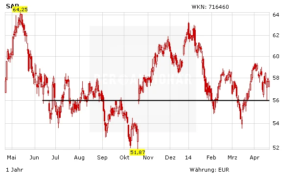 DER AKTIONÄR bleibt ebenfalls optimistisch für die SAP-Aktie. Die horizontale Unterstützung bei 56 Euro hat gehalten. Cloud-Computing und Big-Data-Dienstleistungen dürften in der Zukunft eine immer größere Rolle spielen. Wie die Zahlen zum ersten Quartal beweisen, ist SAP auf dem besten Weg sich in diesem Markt zu etablieren.