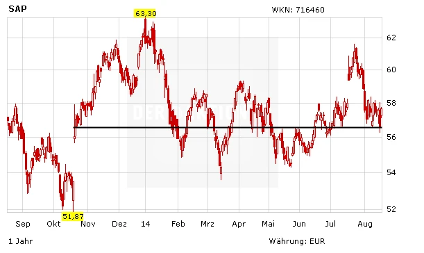 Die Aktie von SAP war im Zuge der Marktkorrektur ebenfalls unter Druck geraten, die Marke von 57 Euro konnte aber erneut erfolgreich verteidigt werden. Mit einem Plus von 1,9 Prozent auf 57,65 Euro gehört das Papier am heutigen Montag zu den stärksten Aktien im DAX. Anleger bleiben bei der Aktie weiter investiert, sichern ihre Position aber mit einem Stopp bei 55 Euro nach unten ab.