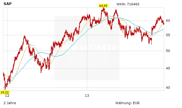 DER AKTIONÄR hat sich bereits mehrfach positiv zur Aktie des Walldorfer Softwarekonzerns geäußert. Diese Einschätzung gilt unverändert. Der Branchenriese ist stark aufgestellt und mit einem 2014er-KGV von 18 im Branchenvergleich attraktiv bewertet. Damit stehen die Chancen weiterhin gut, dass die Aktie schon bald wieder Kurs auf das alte Jahreshoch von 65 Euro nimmt.