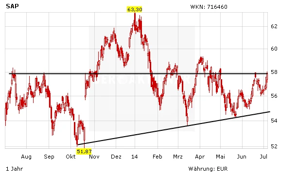 DER AKTIONÄR ist zuversichtlich für die weitere Kursentwicklung der SAP-Aktie. Seit dem Abschluss der Bodenbildung Mitte Juni sind die Bullen am Zug. Mit der Fokussierung auf Cloud- und Big-Data-Dienstleistungen befindet sich der Softwarekonzern auf dem richtigen Weg. Anleger bleiben dabei. Das Kursziel auf Jahrssicht lautet nach wie vor 75 Euro.