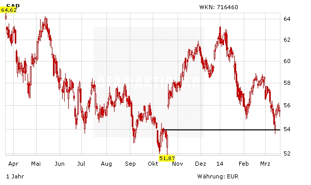 DER AKTIONÄR hält an seiner positiven Haltung für SAP fest. Die Aktie des Softwarekonzerns bleibt ein attraktives Investment. Mit zukunftsweisenden Technologien wie Big-Data-Dienstleistungen und dem Cloud-Geschäft ist der Konzern bestens gerüstet. Ein Abstauberlimit bietet sich bei 54 Euro. Das Kursziel lautet weiterhin 75 Euro.