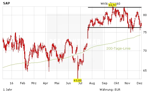Der Ausbruch lässt weiter auf sich warten. Am Montag zählt SAP zu den schwächeren Werten im DAX. Damit bewegt sich der Softwaretitel nach wie vor im Bereich von 77 Euro. Diese Marke bildet die untere Begrenzung des engen Seitwärtstrends, in dem die Aktie der Walldorfer inzwischen seit Mitte Juli pendelt.