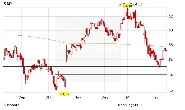 Charttechnisch steht die SAP-Aktie vor dem Widerstand bei der 200-Tage-Linie. Kann dieser überwunden werden, ist Luft bis zum Jahreshoch bei 64,95 Euro. Eine Unterstützung findet sich bei 55,00 Euro.