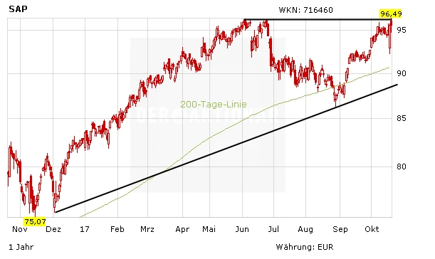Die SAP-Aktie hat im heutigen Handel bei 96,49 Euro ein neues Rekordhoch markiert. Geht es nach der Meinung vieler Analysten, so ist das Ende der Fahnenstange bei Weitem nicht erreicht. Auch DER AKTIONÄR bleibt nach den eher durchwachsenen Quartalszahlen zum dritten Quartal optimistisch für die DAX-Titel gestimmt.
