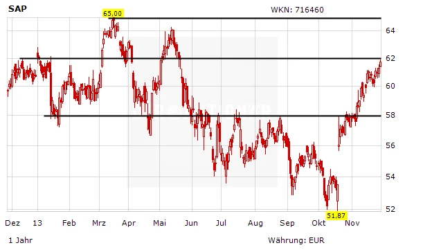 Seit Europas größte Softwareschmiede SAP Ende Oktober die jüngsten Quartalszahlen bekanntgab, schraubt sich die Aktie unbeirrbar in die Höhe. Mittlerweile notiert der DAX-Titel am nächsten wichtigen Widerstand bei 62 Euro.