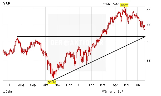 Positiv: Auch SAP setzt zunehmend auf das Cloud-Geschäft. Auf der Hauptversammlung hat Konzernchef Bill McDermott zuletzt erneut Unterstützung für seine Strategie erhalten. Der schwache Gesamtmarkt hat die Aktie der Walldorfer in den vergangenen Wochen allerdings deutlich belastet. Seit Anfang April hat der Kurs um etwa zehn Prozent nachgegeben.