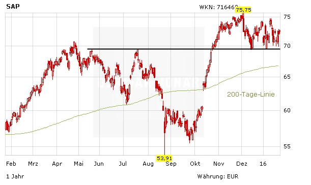 Dass die Anleger die Fokussierung auf das Cloud-Geschäft honorieren, ist im Chart deutlich sichtbar. Im schwachem Gesamtmarkt der letzten Wochen hat sich die SAP-Aktie sehr gut behauptet und notiert in der Nähe ihres Allzeithochs von 75,75 Euro. Anleger greifen wegen dieser Relativen Stärke weiterhin zu. Das Kursziel lautet 85,00 Euro. Warum die SAP-Aktie auch im Duell mit dem US-Konkurrenten Oracle die Nase vorne hat, lesen Sie hier nach.