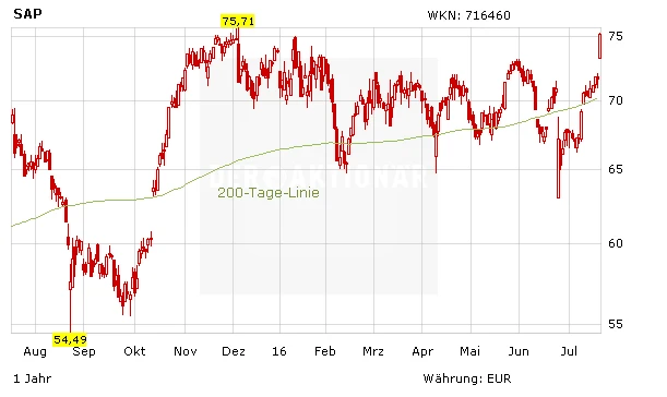 Im Verlauf des heutigen Handelstages hat die SAP-Aktie ihre Gewinne weiter ausgebaut. Das Allzeithoch von 75,71 Euro könnte auch noch fallen. Für Impulse sorgen Aussagen aus der Vorstandsebene und die durch die Bank positiven Analystenstimmen.