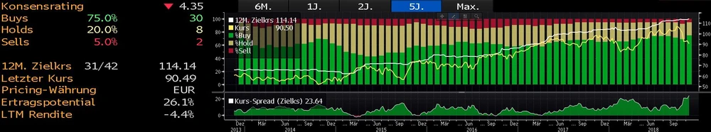 Insgesamt liegt das Konsensziel der Analysten nach der Ankündigung beinahe unverändert bei 114 Euro und damit rund 26 Prozent über dem aktuellen Kurs. 30 Analysten sehen die Aktie von SAP dabei als Kauf an, acht empfehlen zu halten, nur zwei raten zum Verkauf.