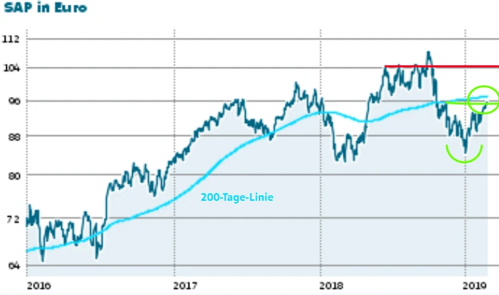 Die seit Ende 2018 laufende Stabilisierung beziehungsweise Bodenbildung wäre mit dem Sprung über den horizontalen Widerstand bei 95,50 Euro abgeschlossen. Kann die SAP-Aktie diese Hürde nachhaltig überwinden, dann ist eine dynamische Fortsetzung der Aufwärtsbewegung wahrscheinlich. Auf dem Weg zu dreistelligen Notierungen warten die 200-Tage-Linie bei 96,73 Euro und der horizontale Widerstand bei 98 Euro. Passt das Marktumfeld, sollte das DAX-Schwergewicht danach den langfristigen Aufwärtstrends fortsetzen und neue Rekordstände ansteuern.