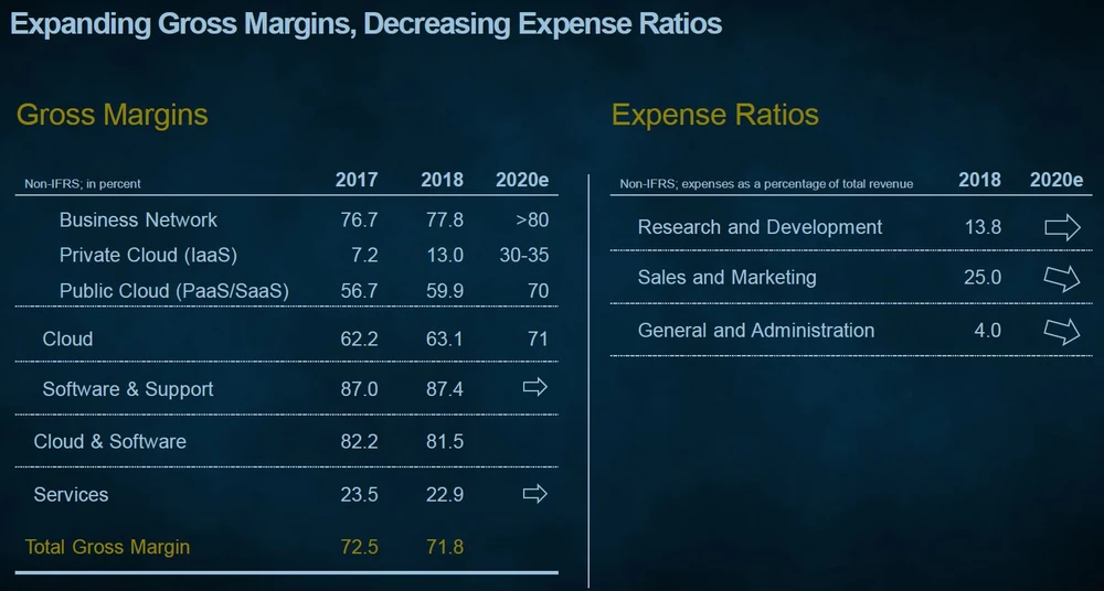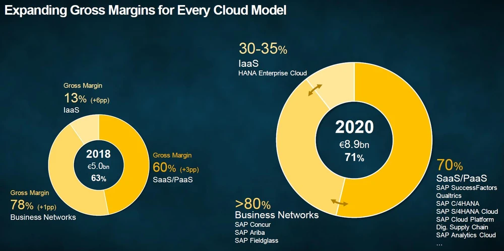 Um dieses Ziel zu erreichen, setzt der Konzern auf steigende Margen im wachsenden Cloud Geschäft. Denn laut Finanzchef Mucic soll sich nicht nur der Cloud-Umsatz verdreifachen sondern auch die Margen ein bedeutend höheres Niveau erreichen. Mucic stellt für 2020 eine Bruttomarge von 71 Prozent in Aussicht. Im bereits starken Jahr 2018 lag die Bruttomarge noch bei 63 Prozent. Diese Finanzplanung sei jedoch erreichbar und eher konservativ angesetzt.