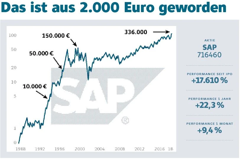 Software made in Germany ist das Erfolgsrezept des Softwareentwicklers SAP. Im Jahre 1972 gründeten fünf ehemalige IBM-Mitarbeiter das aktuell wertvollste Unternehmen Deutschlands. 1988 ging der Softwareentwickler an die Börse. Wer damals umgerechnet 2.000 Euro in die Aktie investierte, sitzt heute auf einem sechsstelligen Gewinn – und das ist noch nicht einmal das Beste.