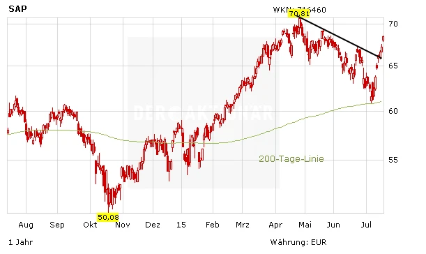Charttechnisch gesehen hat die Aktie hat den kurzfristigen Abwärtstrend nach oben verlassen. Als Zielzone gilt nun das Allzeithoch aus dem April 2015 bei 70,81 Euro.