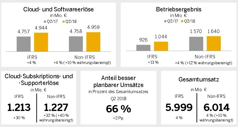 Sowohl der Gesamtumsatz (Non-IFRS) als auch das Betriebsergebnis lag leicht über den Analystenschätzungen von 5,92 Milliarden Euro respektive 1,635 Milliarden Euro. Während das Cloud-Geschäft mit Mietsoftware um 40 Prozent zulegte, verlor das Lizenz-Geschäft weiter an Boden und Bedeutung.