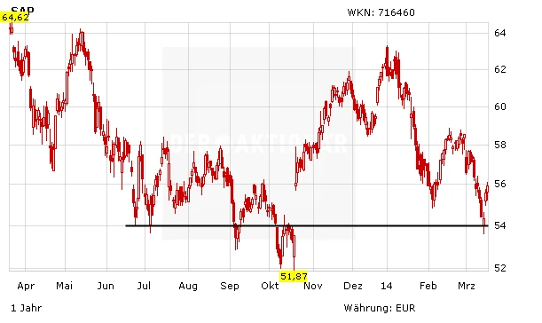 Die SAP-Aktie reagiert am Mittwoch kaum auf die Zahlen. Zuletzt prallte der DAX-Titel an der horizontalen Widerstandslinie bei 54,00 Euro ab. Für Unterstützung sorgten zuletzt zahlreiche positive Analystenstatements. Die Computermesse CeBIT machte zudem deutlich, dass sich SAP mit seinen zukunftsweisenden Technologien Big Data und Cloud Computing auf dem richtigen Weg befindet. Investierte Anleger bleiben dabei. Auch für einen Neueinstieg ist es nicht zu spät.