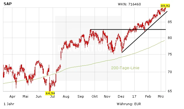 SAP bleibt einer der DAX-Favoriten von DER AKTIONÄR und weiter klar auf Wachstumskurs. Investierte Anleger setzen auf eine Trendfortsetzung und neue Höchststände – Stopp bei 75 Euro platzieren.