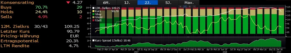 Nachdem die Bank of America Merill Lynch die SAP-Aktie herabgestuft hat, sehen nur noch 29 Analysten in den DAX-Titeln einen „Kauf“. Das durchschnittliche Kursziel hat sich nach einem enttäuschenden vierten Quartal deutlich von 113 auf 109 Euro gesenkt. Damit trauen die Analysten dem Software-Konzern aber immer noch ein Kurspotenzial von rund 20 Prozent zu.