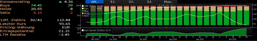 Auch von Seiten der Analysten gab es keine klaren positiven Signale. Die generelle Einschätzung blieb gleich, auch wenn der ein oder andere etwas am Kursziel schraubte. Der Konsens blieb dabei beinahe unverändert: 29 Analysten sagen weiterhin „Kaufen“. Das Kursziel von 113,44 Euro liegt dabei deutlich über dem aktuellen Kurs.