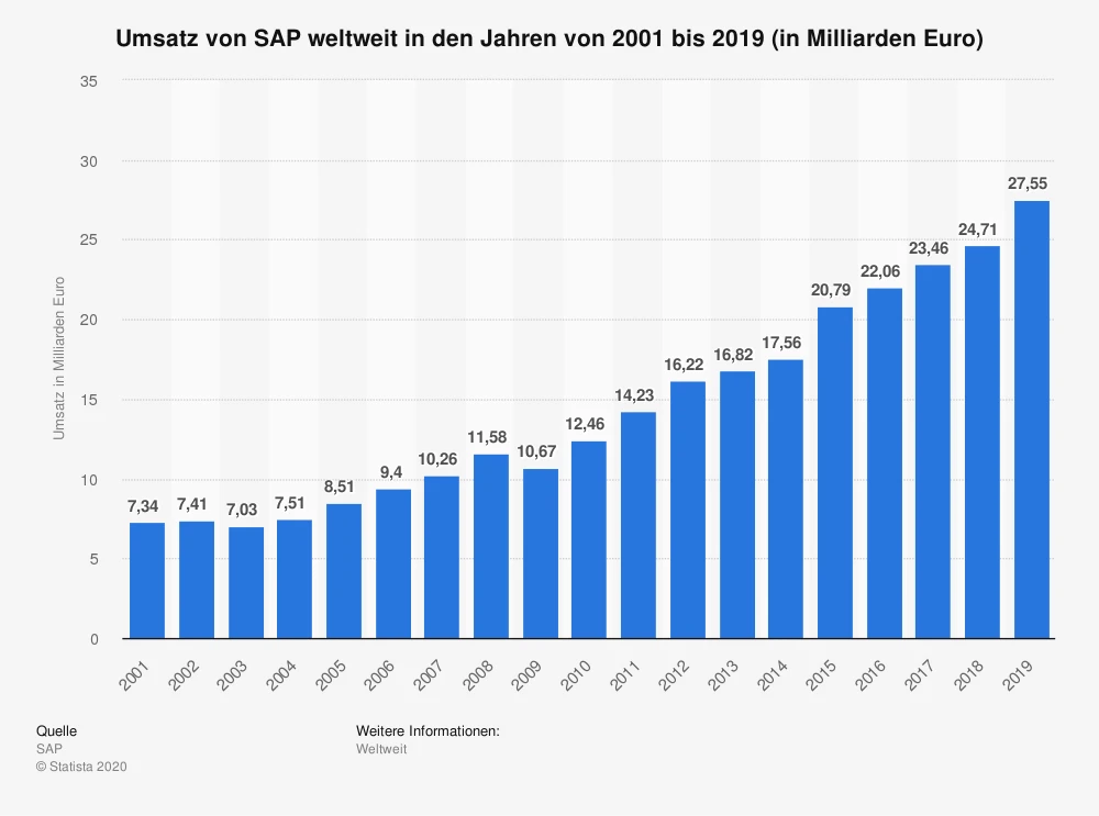 Auch der Blick auf die Umsatzzahlen des Softwareriesen aus Walldorf spricht Bände: SAP überzeugt von Jahr zu Jahr durch zweistellige Wachstumsraten (siehe Grafik).