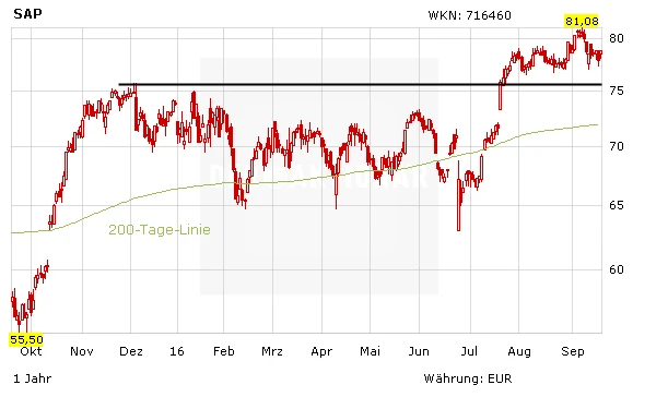 Die Entwicklung bei SAP ist sehr erfreulich. Durch den zunehmenden Fokus auf die zukunftsträchtige Cloud-Sparte ist die Fantasie beim DAX-Titel groß. Dies spiegelt sich auch im Aktienkurs wieder. Derzeit notiert der Titel nur knapp unterhalb des Allzeithochs bei 81,08 Euro.