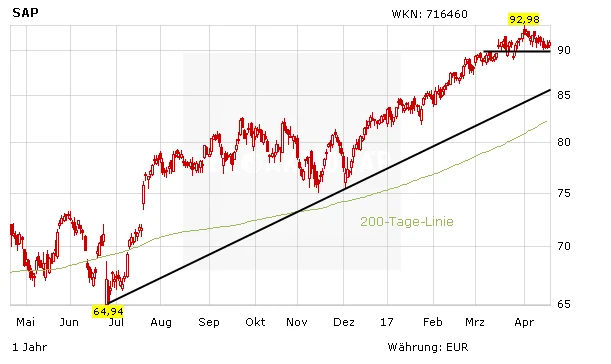 Wesentlich weiter aus dem Fenster lehnt sich die US-Bank Goldman Sachs. SAP gehört weiterhin zur "Conviction Buy List" und wird unverändert zum Kauf empfohlen. Das Kursziel beträgt 110 Euro. Experte Mohammed Moawalla betont, dass sowohl die Lizenzeinnahmen und das Cloud-Geschäft mit Mietsoftware als auch die operative Marge zu den wichtigsten Themen am 25. April zählen werden.