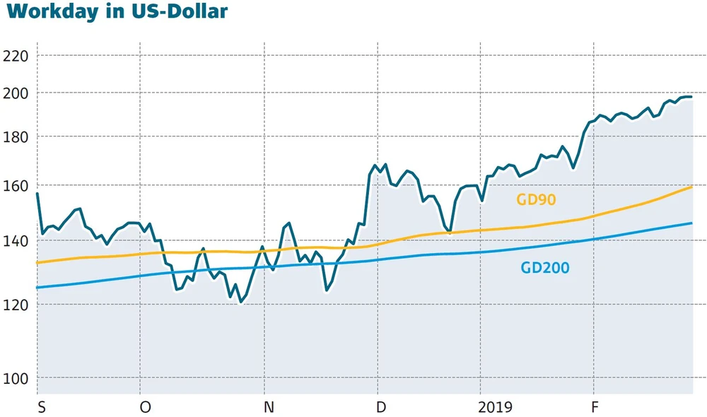 Workday gilt als das führende Software-Unternehmen im Bereich des Human-Resources-Management. Zusätzliches Wachstum beschert die Expansion in Finanzsoftware. So bietet Workday Lösungen für die Buchhaltung, die Innenrevision oder die Finanzplanung. Die hohe Kundenzufriedenheit, eine erklärter Kernfokus des jungen Unternehmens, hilft dabei, bestehenden Kunden zusätzliche Software zu verkaufen. Aktuell zählen 40 Prozent der Unternehmen auf der Fortune 500 Liste zu den Workday-Kunden – Tendenz steigend. Zudem wurde der US-Konzern auf der Fortune-Liste der 100 besten Arbeitsplätze mit dem vierten Platz ausgezeichnet.