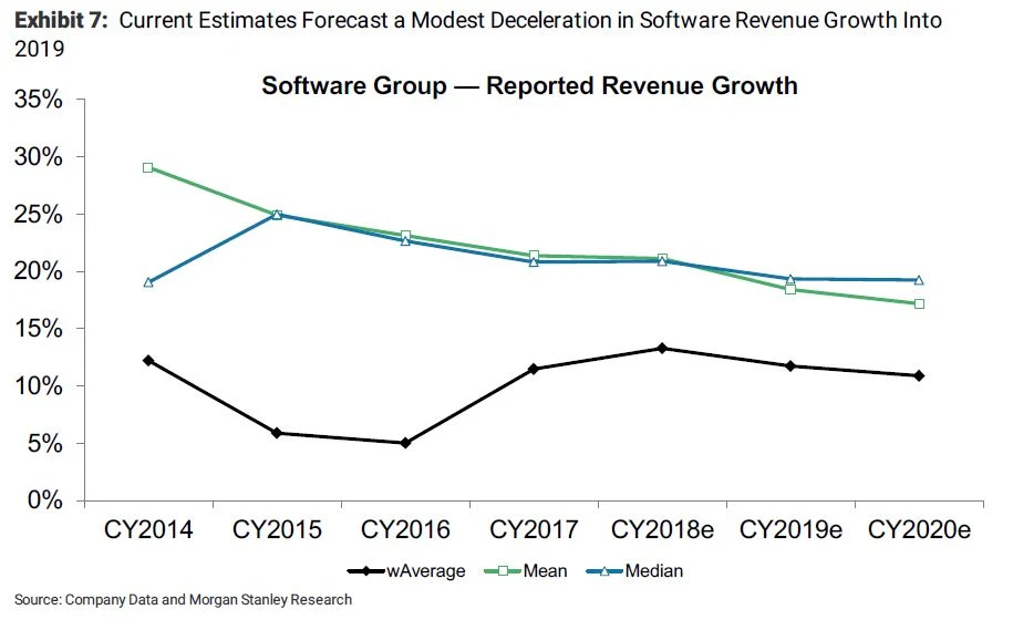 Der Aktie von SAP, dem führenden Unternehmens-Software-Anbieter aus Europa, sollten die starken Zahlen aus den USA zum Ende der Woche ebenfalls neuen Schwung geben. Die Q4-Zahlen und auch der Ausblick zeigen: Die Chief Information Officer der US-Konzerne sind bereit in Enterprise-Software unverändert hohe Summen zu investieren. Das anhaltende Wachstum der Branche zeigt auch die unten stehende Grafik von Morgan Stanley.