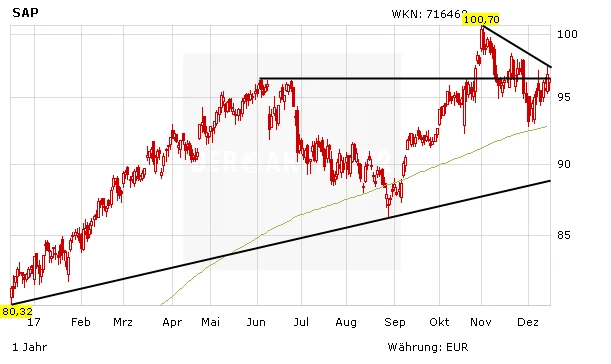 DER AKTIONÄR favorisiert weiterhin die Papiere von SAP. Gelingt der nachhaltige Sprung über die Marke von 96,50 Euro dürfte das Rekordhoch bei 100,70 Euro in den Fokus. 2018 sollten zweistellige Notierungen endgültig passé sein und die Aktie weiter den Weg nach oben einschlagen.
