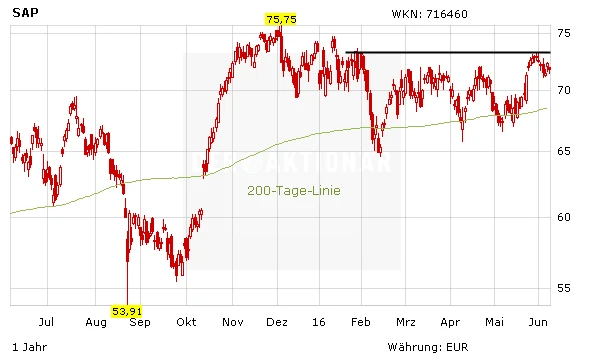 Charttechnisch gesehen hinkt das Papier den ausgerufenen Kurszielen hinterher. Die Marke von 73 Euro ist bislang eine Nummer zu groß. An der Einschätzung des AKTIONÄR ändert diese Momentaufnahme aber rein gar nichts: SAP bleibt weiterhin ein klarer Kauf! Das Kursziel beträgt 90 Euro.