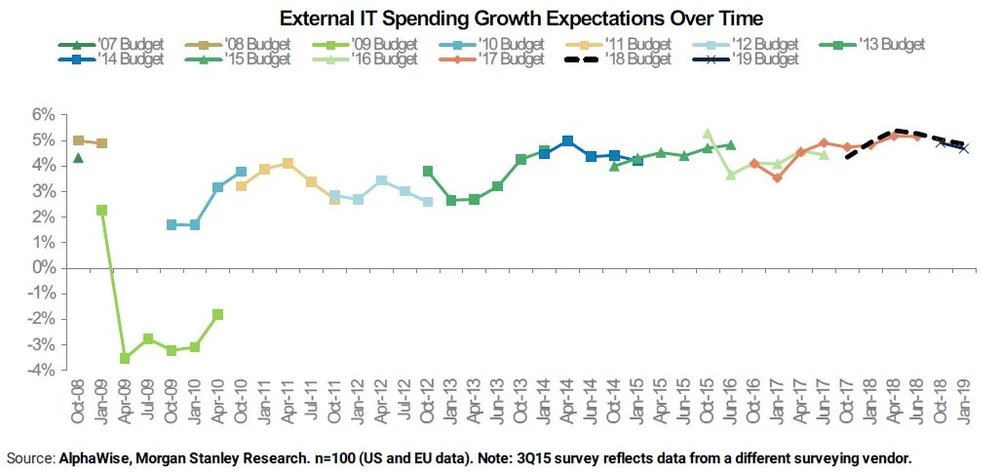 Wie die Prognose von SAP ausfällt, dürfte stark davon abhängen, wie viel 2019 in Software investiert wird. Die Analysten von Morgan Stanley erwarten nach einer Umfrage unter CIOs, dass 2019 die Software-Ausgaben um 5,2 Prozent ansteigen. Zum Vergleich: 2018 wuchsen die Ausgaben um 5,3 Prozent.