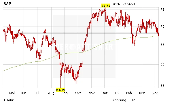 Für die Aktie von SAP verheißen die vorläufigen Zahlen am Montagmorgen nichts Gutes. Frühe vorbörsliche Prognosen erwarten den DAX-Titel deutlich im Minus. Nachdem der Kurs bereits in der Vorwoche die Unterstützung bei 68 Euro gerissen hatte, ist die 200-Tage-Linie, die aktuell bei 67,44 Euro verläuft, in akuter Gefahr. Spätestens wenn der Stoppkurs von 63 Euro erreicht ist, sollten investierte Anleger die Reißleine ziehen.