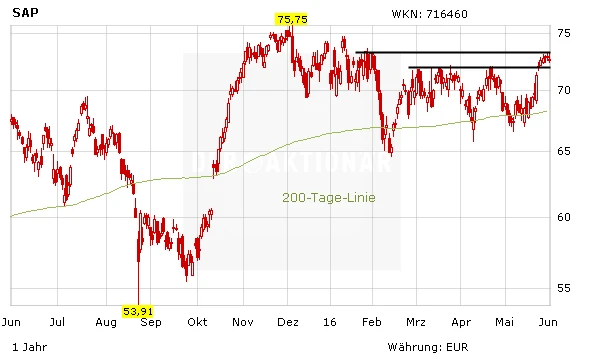 In der Vergangenheit profitierte die SAP-Aktie oftmals von einer angehobenen Prognose des US-Konkurrenten. Ein ähnlicher Impuls wäre nötig gewesen, um die enge Handelsspanne zwischen 71,81 Euro und 73,00 Euro nach oben zu verlassen. Damit werden die kommenden Tage spannend, ob das Papier den Weg nach oben weiterhin forsetzt. Für den AKTIONÄR bleibt SAP 2016 eines der Top-Papiere im DAX.