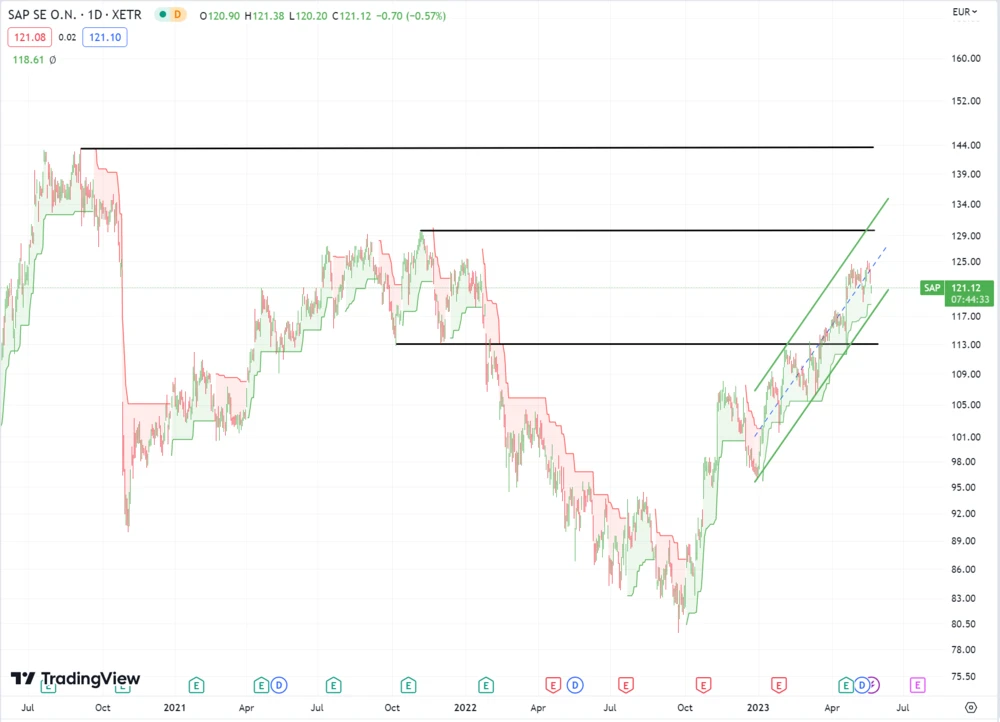 SAP befindet sich seit Januar in einem Aufwärtstrendkanal. Die Aktie meisterte dabei im März den Sprung über die Horizontale bei 113,26 Euro und bestätigte damit den neuen Trend.
