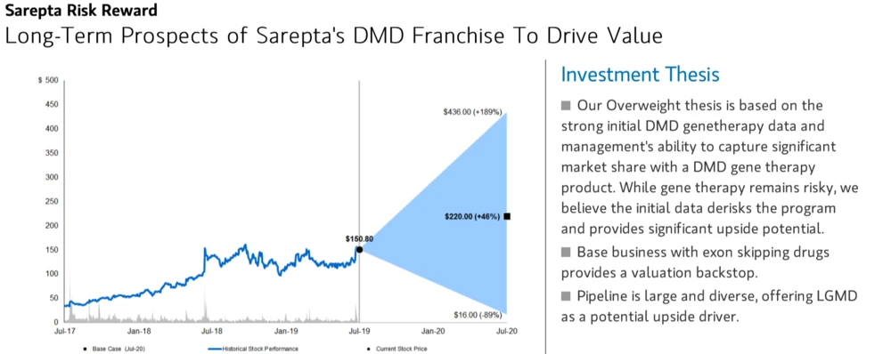 Zu einer positiven Einschätzung kommen jüngst auch die Analysten von Morgan Stanley. Matthew Harrison belässt die Papiere auf "Overweight", das Kursziel wird jedoch deutlich von 165 auf 220 Dollar angehoben. Demnach könne Sareptas Gentherapie zur Behandlung der Muskeldystrophie Typ Duchenne die erste auf dem Markt sein und den größten Teil des Markes (Potenzial von 20 Milliarden Dollar) für sich beanspruchen.