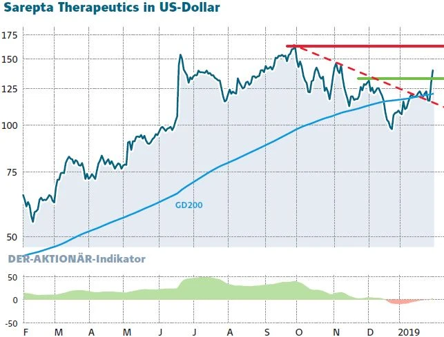 Die Aktie von Sarepta hatte sich seit Anfang 2017 zwischenzeitlich versiebenfacht, in den vergangenen Monaten vollzog der Wert eine gesunde Konsolidierung. Diese könnte nun aber abgeschlossen sein. Mit dem jüngsten Kursanstieg über die 200-Tage-Linie hat das Papier ein Kaufsignal generiert. Profitiert hat die Aktie dabei von einer Kaufempfehlung des Analystenhauses Piper Jaffray im Vorfeld der bevorstehenden Gliedergürteldystrophie-(LGMD)-Daten. Piper Jaffray erhöhte das Kursziel von 168 Dollar auf 200 Dollar, was beim aktuellen Kurs ein Potenzial von 43 Prozent bedeutet. Noch etwas optimistischer zeigt sich das Analystenhaus Fitzgerald mit einem Kursziel von 217 Dollar. Viele Marktteilnehmer hatten bereits auf der JP Morgan Healthcare Conference Anfang Januar auf die LGMD-Daten gehofft, weswegen die Aktie im Januar vorübergehend unter Druck stand.