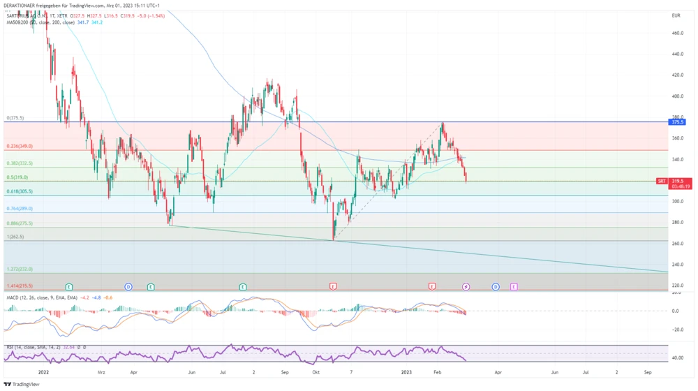 Denn der Kurs befindet sich exakt zwischen dem 50%- und dem 61,8%-Fibonacci-Retracement bei 319,00 respektive 305,50 Euro. Dieser Bereich stellt eine starke Unterstützung dar und könnte den nächsten Impuls nach oben einleiten.